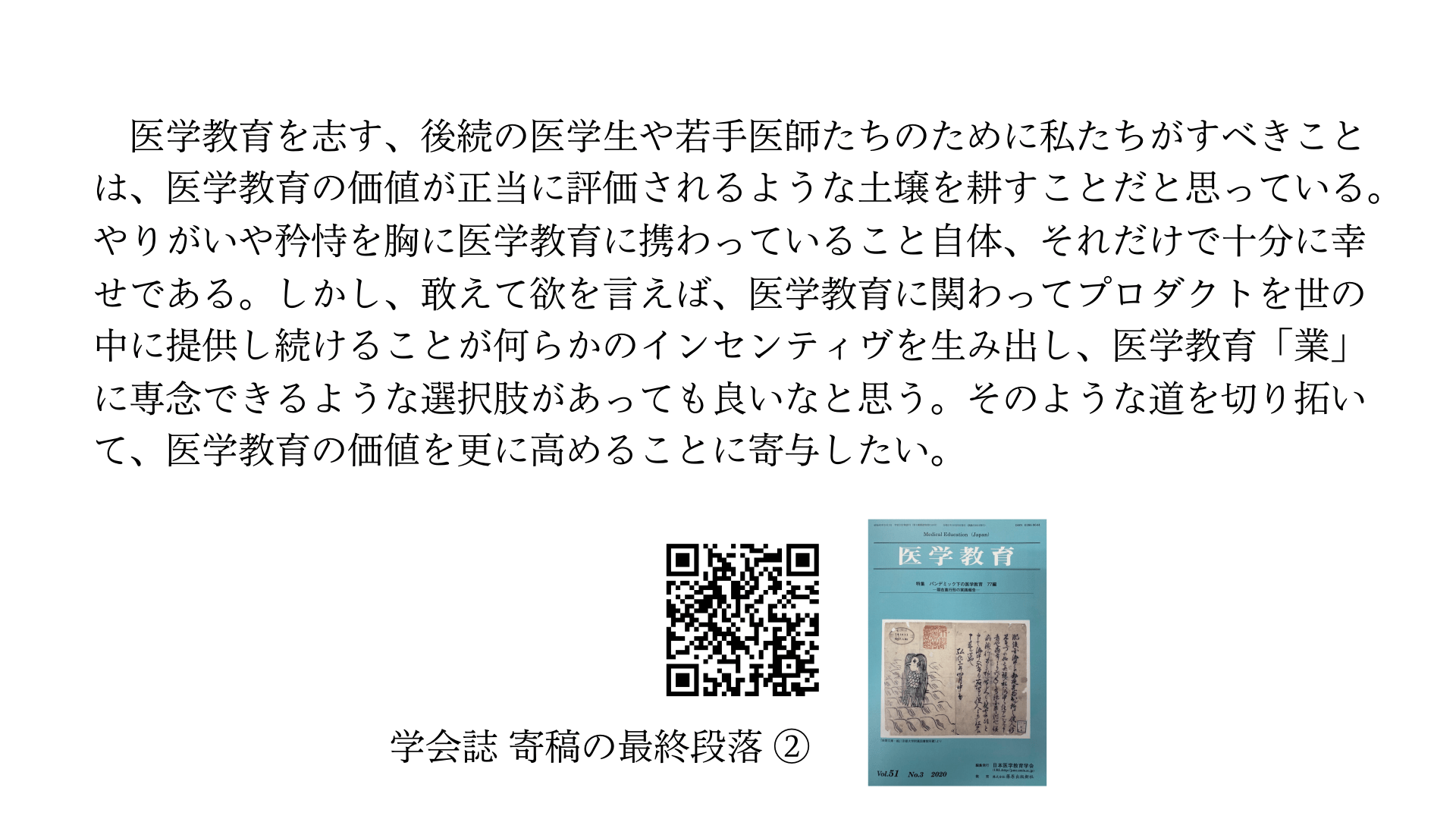 #50. 医学教育を志す、後続の医学生や若手医師たちのために私たちがすべきこと は、医学教育の価値が正当に評価されるような土壌を耕すことだと思っている。 やりがいや矜恃を胸に医学教育に携わっていること自体、それだけで十分に幸 せである。しかし、敢えて欲を言えば、医学教育に関わってプロダクトを世の 中に提供し続けることが何らかのインセンティヴを生み出し、医学教育「業」 に専念できるような選択肢があっても良いなと思う。そのような道を切り拓い て、医学教育の価値を更に高めることに寄与したい。 学会誌 寄稿の最終段落 ②