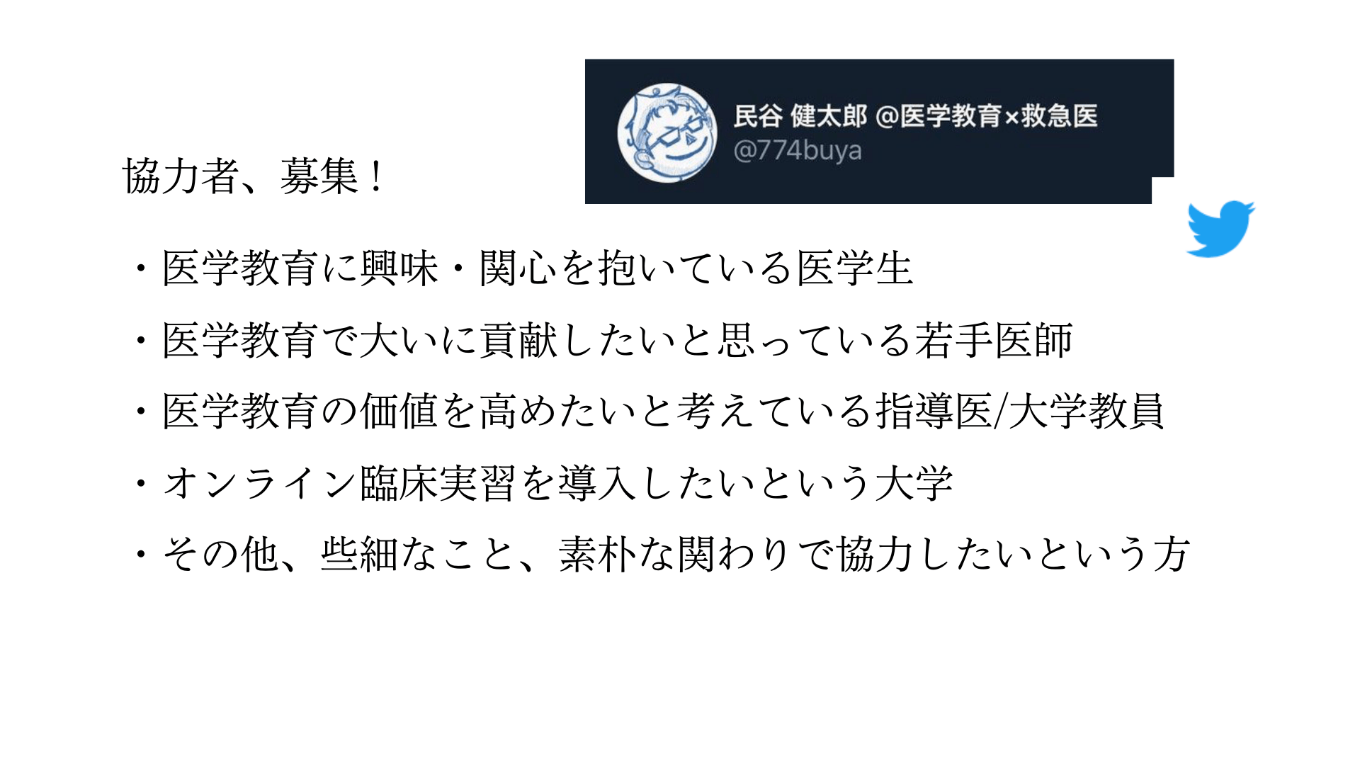 #51. 協力者、募集 ! ・医学教育に興味・関心を抱いている医学生 ・医学教育で大いに貢献したいと思っている若手医師 ・医学教育の価値を高めたいと考えている指導医/大学教員 ・オンライン臨床実習を導入したいという大学 ・その他、些細なこと、素朴な関わりで協力したいという方