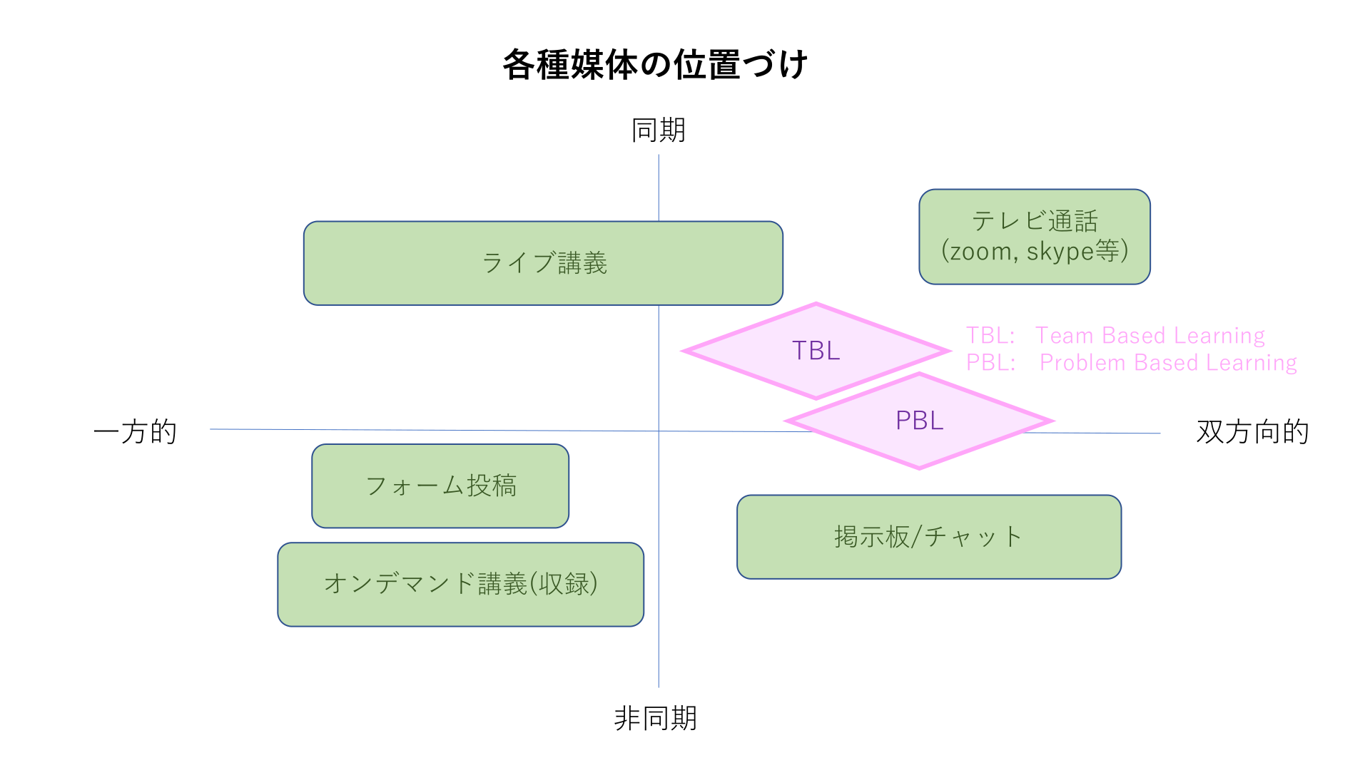 #8. 各種媒体の位置づけ 同期 テレビ通話 (zoom, skype等) ライブ講義 TBL: Team Based Learning PBL: Problem Based Learning TBL PBL ⼀⽅的 フォーム投稿 掲⽰板/チャット オンデマンド講義(収録) ⾮同期 双⽅向的