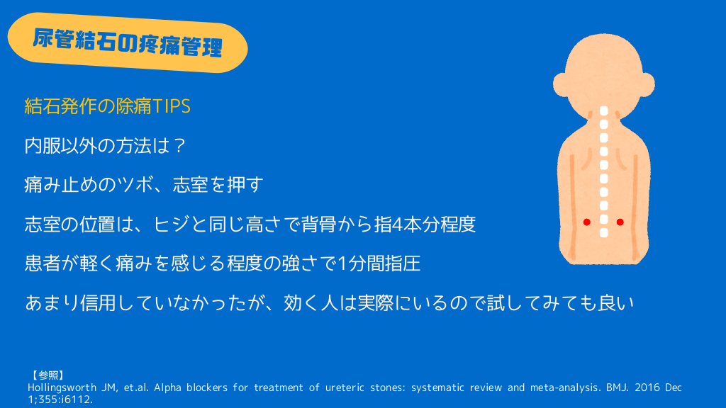 #10. 結石発作の除痛TIPS 内服以外の方法は? 痛み止めのツボ、志室を押す 志室の位置は、ヒジと同じ高さで背骨から指4本分程度 患者が軽く痛みを感じる程度の強さで1分間指圧 あまり信用していなかったが、効く人は実際にいるので試してみても良い 【参照】 Hollingsworth JM, et.al. Alpha blockers for treatment of ureteric stones: systematic review and meta-analysis. BMJ. 2016 Dec 1;355:i6112.