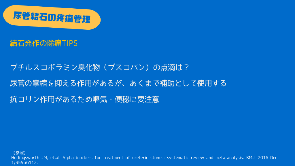 #12. 結石発作の除痛TIPS ブチルスコポラミン臭化物(ブスコパン)の点滴は? 尿管の攣縮を抑える作用があるが、あくまで補助として使用する 抗コリン作用があるため嘔気・便秘に要注意 【参照】 Hollingsworth JM, et.al. Alpha blockers for treatment of ureteric stones: systematic review and meta-analysis. BMJ. 2016 Dec 1;355:i6112.