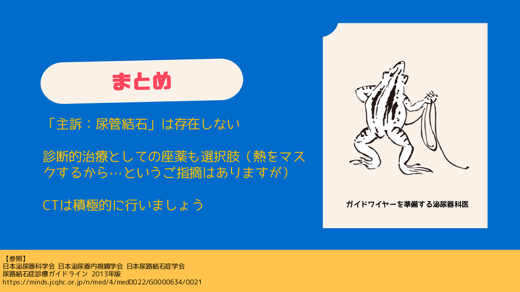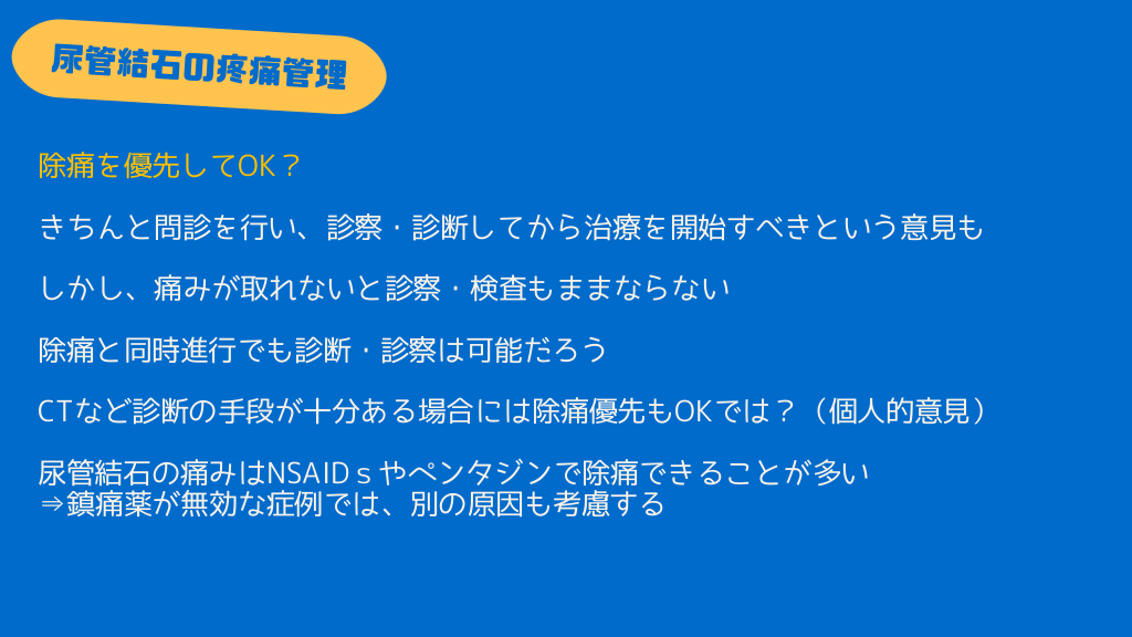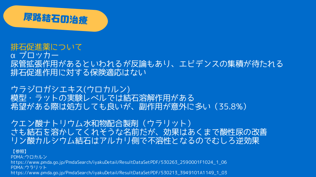 #11. 結石発作の除痛TIPS 排石促進薬の使用は? αブロッカーやCa拮抗薬に排石促進効果があるとの報告があるが、反論もあり 一定していない また、αブロッカーやCa拮抗薬に排石促進作用としての保険適応はない 少なくとも即効性はないので、ERでの点滴や内服などは不要だろう 【参照】 Hollingsworth JM, et.al. Alpha blockers for treatment of ureteric stones: systematic review and meta-analysis. BMJ. 2016 Dec 1;355:i6112.