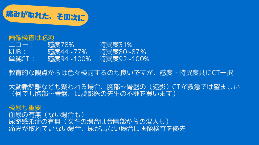 #14. 画像検査は必須 エコー: 感度78% KUB: 感度44~77% 単純CT: 感度94~100% 特異度31% 特異度80~87% 特異度92~100% 教育的な観点からは色々検討するのも良いですが、感度・特異度共にCT一択 大動脈解離なども疑われる場合、胸部~骨盤の(造影)CTが救急では望ましい (何でも胸部~骨盤、は読影医の先生の不興を買います) 検尿も重要 血尿の有無(ない場合も) 尿路感染症の有無(女性の場合は会陰部からの混入も) 痛みが取れていない場合、尿が出ない場合は画像検査を優先