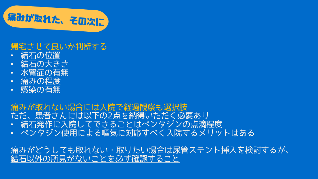 #15. 帰宅させて良いか判断する • 結石の位置 • 結石の大きさ • 水腎症の有無 • 痛みの程度 • 感染の有無 痛みが取れない場合には入院で経過観察も選択肢 ただ、患者さんには以下の2点を納得いただく必要あり • 結石発作に入院してできることはペンタジンの点滴程度 • ペンタジン使用による嘔気に対応すべく入院するメリットはある 痛みがどうしても取れない・取りたい場合は尿管ステント挿入を検討するが、 結石以外の所見がないことを必ず確認すること