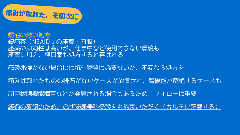 #16. 帰宅の際の処方 鎮痛薬(NSAIDsの座薬・内服) 座薬の即効性は高いが、仕事中など使用できない環境も 座薬に加え、経口薬も処方すると喜ばれる 感染兆候がない場合には抗生物質は必要ないが、不安なら処方を 痛みは取れたものの排石がないケースが放置され、腎機能が廃絶するケースも 副甲状腺機能障害などが発見される場合もあるため、フォローは重要 経過の確認のため、必ず泌尿器科受診をお約束いただく(カルテに記載する)