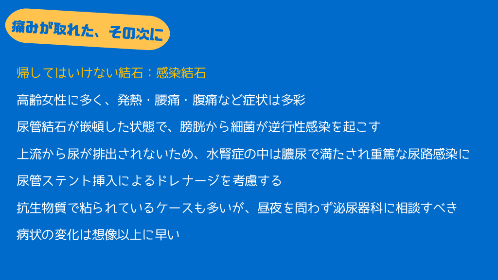 #17. 帰してはいけない結石:感染結石 高齢女性に多く、発熱・腰痛・腹痛など症状は多彩 尿管結石が嵌頓した状態で、膀胱から細菌が逆行性感染を起こす 上流から尿が排出されないため、水腎症の中は膿尿で満たされ重篤な尿路感染に 尿管ステント挿入によるドレナージを考慮する 抗生物質で粘られているケースも多いが、昼夜を問わず泌尿器科に相談すべき 病状の変化は想像以上に早い