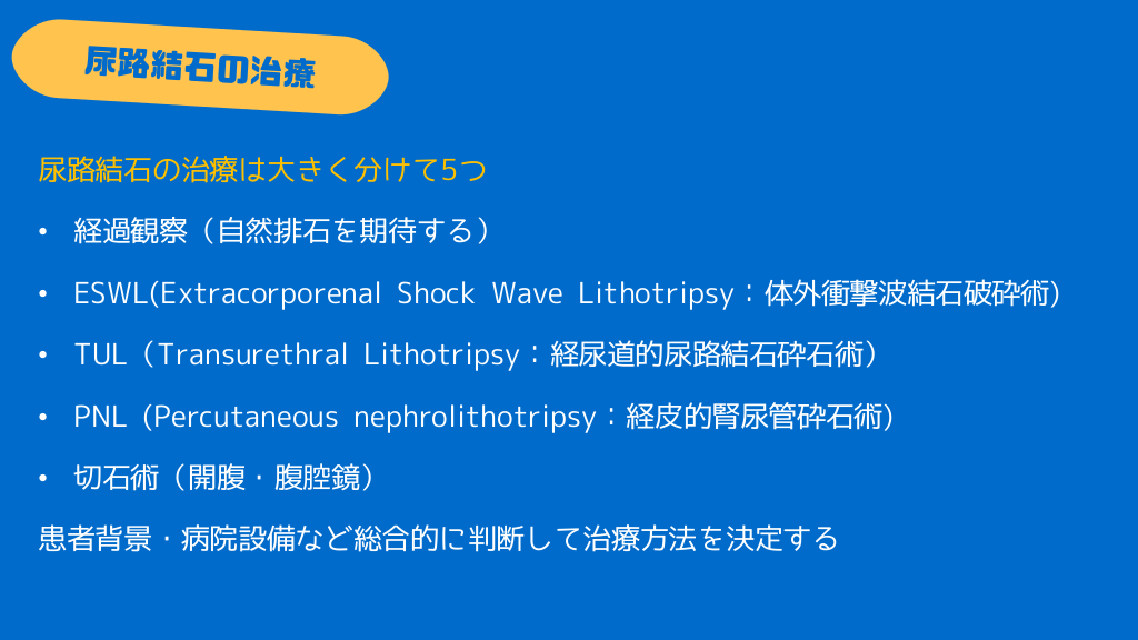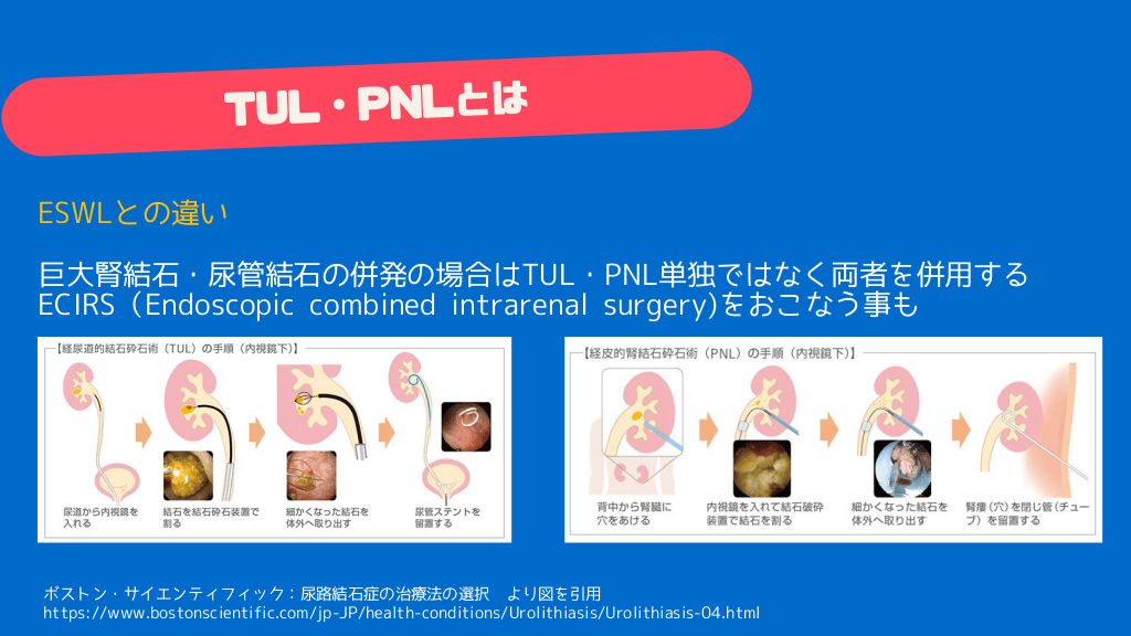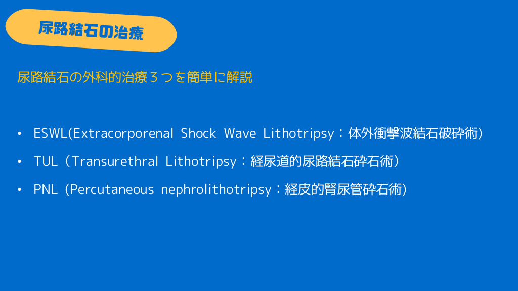 #26. 尿路結石の外科的治療3つを簡単に解説 • ESWL(Extracorporenal Shock Wave Lithotripsy:体外衝撃波結石破砕術) • TUL(Transurethral Lithotripsy:経尿道的尿路結石砕石術) • PNL (Percutaneous nephrolithotripsy:経皮的腎尿管砕石術)
