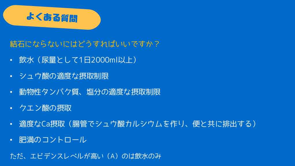 #24. 結石にならないにはどうすればいいですか? • 飲水(尿量として1日2000ml以上) • シュウ酸の適度な摂取制限 • 動物性タンパク質、塩分の適度な摂取制限 • クエン酸の摂取 • 適度なCa摂取(腸管でシュウ酸カルシウムを作り、便と共に排出する) • 肥満のコントロール ただ、エビデンスレベルが高い(A)のは飲水のみ
