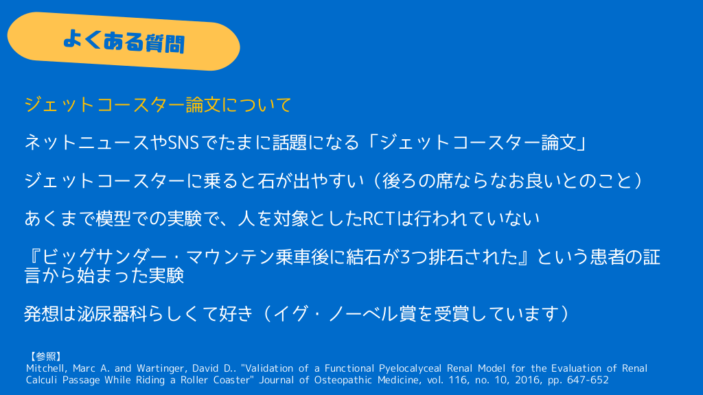 #25. ジェットコースター論文について ネットニュースやSNSでたまに話題になる「ジェットコースター論文」 ジェットコースターに乗ると石が出やすい(後ろの席ならなお良いとのこと) あくまで模型での実験で、人を対象としたRCTは行われていない 『ビッグサンダー・マウンテン乗車後に結石が3つ排石された』という患者の証 言から始まった実験 発想は泌尿器科らしくて好き(イグ・ノーベル賞を受賞しています) 【参照】 Mitchell, Marc A. and Wartinger, David D.. "Validation of a Functional Pyelocalyceal Renal Model for the Evaluation of Renal Calculi Passage While Riding a Roller Coaster" Journal of Osteopathic Medicine, vol. 116, no. 10, 2016, pp. 647-652