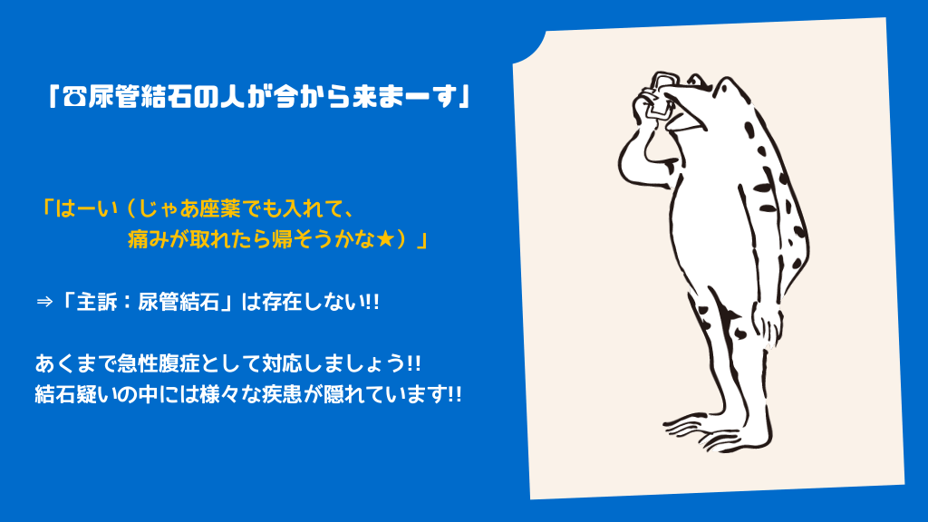 #3. 「☎尿管結石の人が今から来まーす」 「はーい(じゃあ座薬でも入れて、 痛みが取れたら帰そうかな★)」 ⇒「主訴:尿管結石」は存在しない!! あくまで急性腹症として対応しましょう!! 結石疑いの中には様々な疾患が隠れています!!