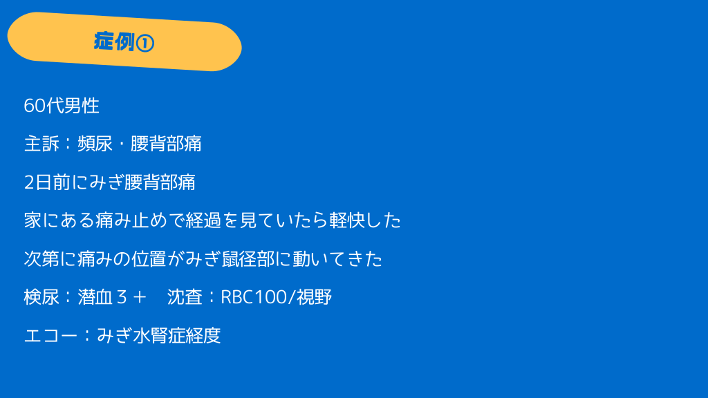 #33. 60代男性 主訴:頻尿・腰背部痛 2日前にみぎ腰背部痛 家にある痛み止めで経過を見ていたら軽快した 次第に痛みの位置がみぎ鼠径部に動いてきた 検尿:潜血3+ 沈査:RBC100/視野 エコー:みぎ水腎症経度