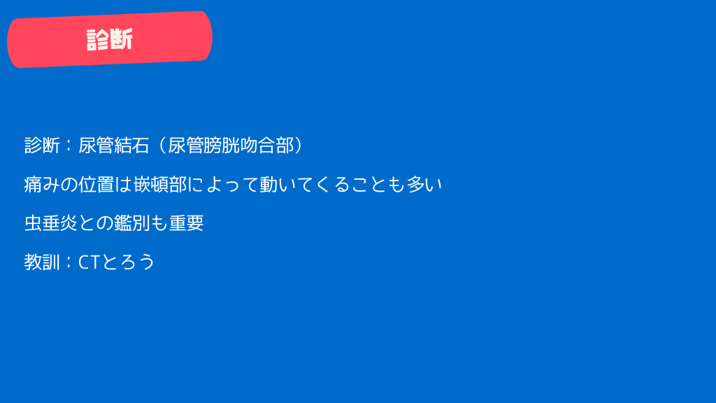 #34. 診断:尿管結石(尿管膀胱吻合部) 痛みの位置は嵌頓部によって動いてくることも多い 虫垂炎との鑑別も重要 教訓:CTとろう