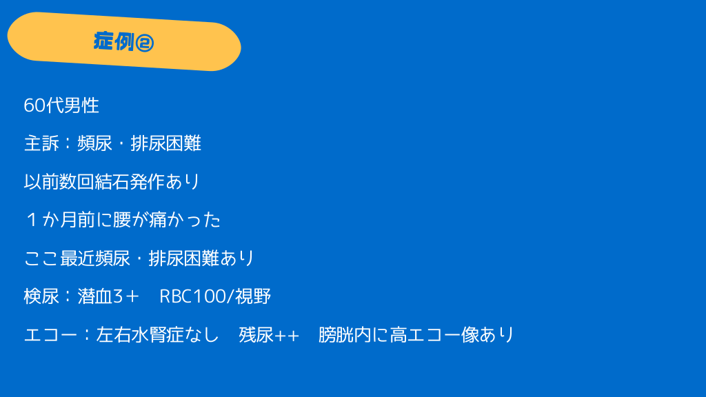 #35. 60代男性 主訴:頻尿・排尿困難 以前数回結石発作あり 1か月前に腰が痛かった ここ最近頻尿・排尿困難あり 検尿:潜血3+ RBC100/視野 エコー:左右水腎症なし 残尿++ 膀胱内に高エコー像あり