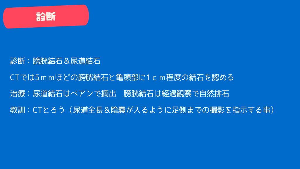 #36. 診断:膀胱結石&尿道結石 CTでは5mmほどの膀胱結石と亀頭部に1cm程度の結石を認める 治療:尿道結石はペアンで摘出 膀胱結石は経過観察で自然排石 教訓:CTとろう(尿道全長&陰嚢が入るように足側までの撮影を指示する事)