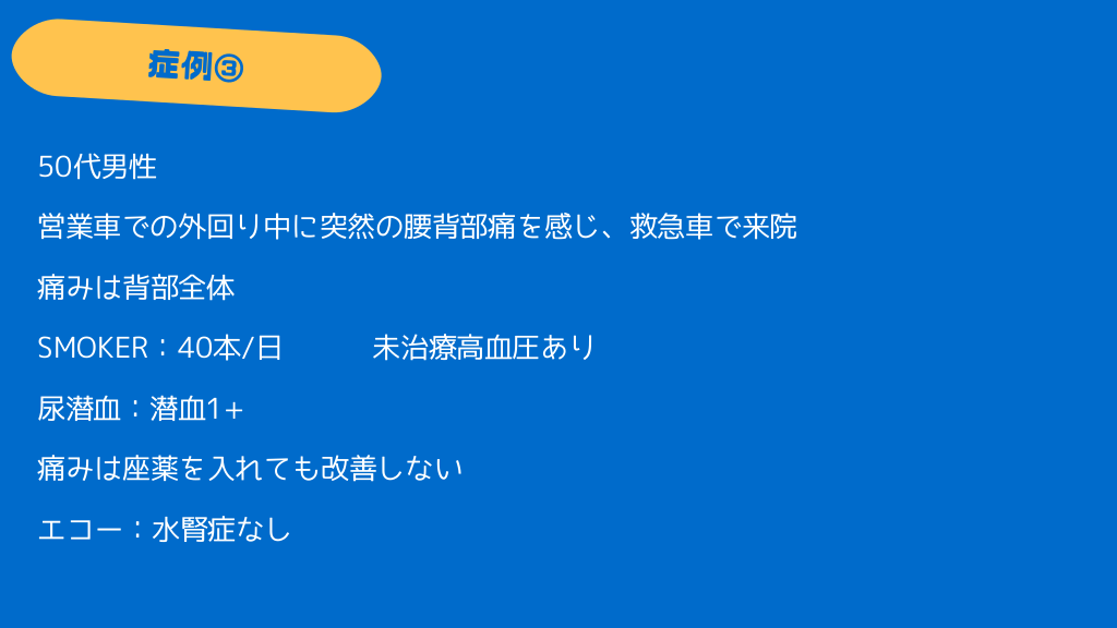 #37. 50代男性 営業車での外回り中に突然の腰背部痛を感じ、救急車で来院 痛みは背部全体 SMOKER:40本/日 未治療高血圧あり 尿潜血:潜血1+ 痛みは座薬を入れても改善しない エコー:水腎症なし