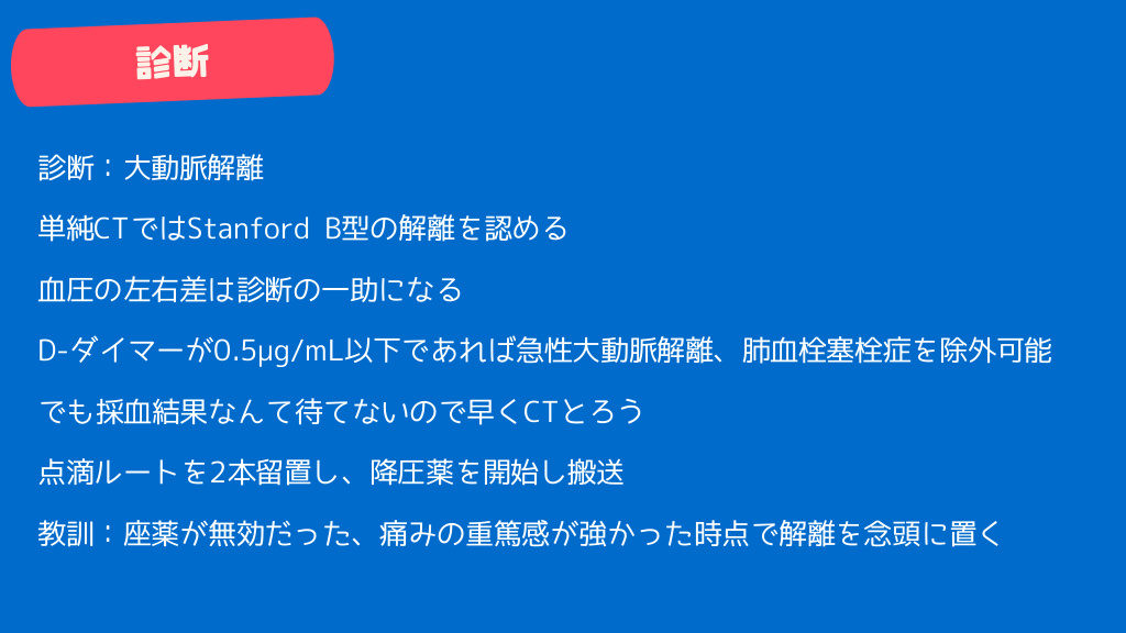 #38. 診断:大動脈解離 単純CTではStanford B型の解離を認める 血圧の左右差は診断の一助になる D-ダイマーが0.5μg/mL以下であれば急性大動脈解離、肺血栓塞栓症を除外可能 でも採血結果なんて待てないので早くCTとろう 点滴ルートを2本留置し、降圧薬を開始し搬送 教訓:座薬が無効だった、痛みの重篤感が強かった時点で解離を念頭に置く