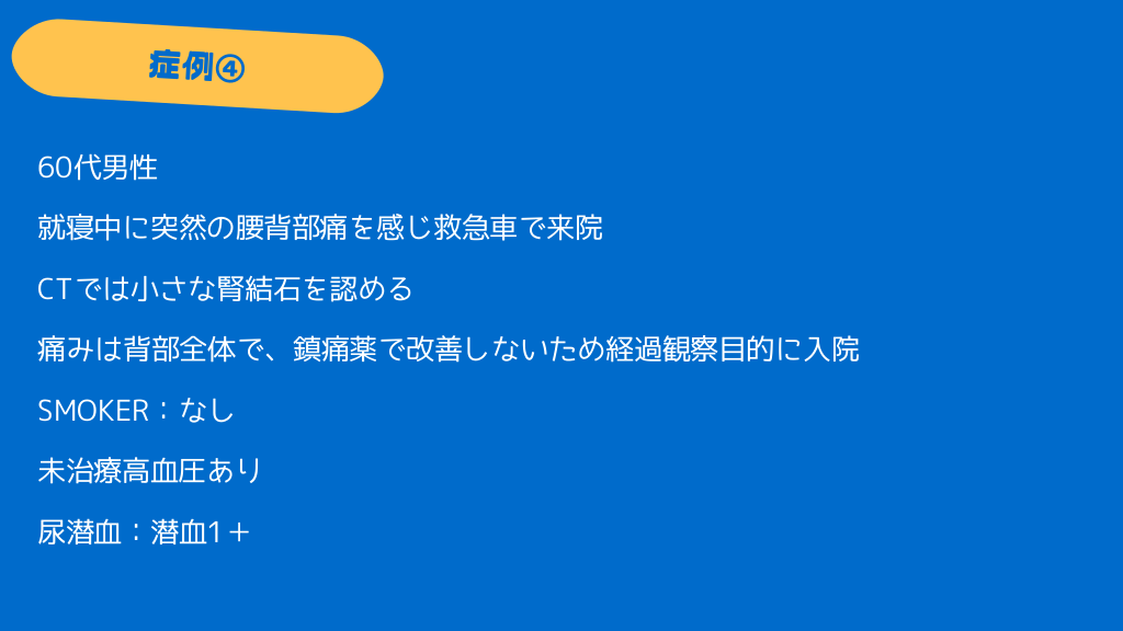 #39. 60代男性 就寝中に突然の腰背部痛を感じ救急車で来院 CTでは小さな腎結石を認める 痛みは背部全体で、鎮痛薬で改善しないため経過観察目的に入院 SMOKER:なし 未治療高血圧あり 尿潜血:潜血1+