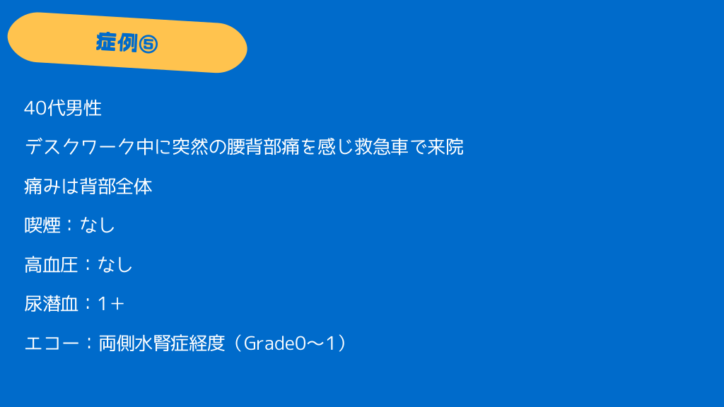 #41. 40代男性 デスクワーク中に突然の腰背部痛を感じ救急車で来院 痛みは背部全体 喫煙:なし 高血圧:なし 尿潜血:1+ エコー:両側水腎症経度(Grade0~1)