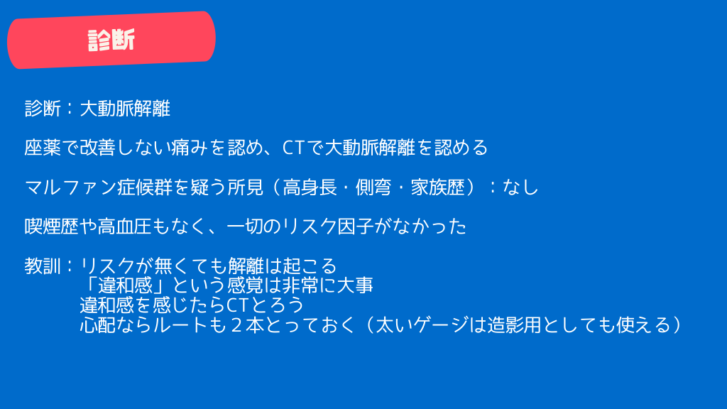 #42. 診断:大動脈解離 座薬で改善しない痛みを認め、CTで大動脈解離を認める マルファン症候群を疑う所見(高身長・側弯・家族歴):なし 喫煙歴や高血圧もなく、一切のリスク因子がなかった 教訓:リスクが無くても解離は起こる 「違和感」という感覚は非常に大事 違和感を感じたらCTとろう 心配ならルートも2本とっておく(太いゲージは造影用としても使える)