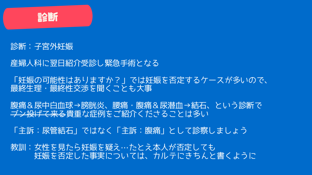 #44. 診断:子宮外妊娠 産婦人科に翌日紹介受診し緊急手術となる 「妊娠の可能性はありますか?」では妊娠を否定するケースが多いので、 最終生理・最終性交渉を聞くことも大事 腹痛&尿中白血球→膀胱炎、腰痛・腹痛&尿潜血→結石、という診断で ブン投げて来る貴重な症例をご紹介くださることは多い 「主訴:尿管結石」ではなく「主訴:腹痛」として診察しましょう 教訓:女性を見たら妊娠を疑え…たとえ本人が否定しても 妊娠を否定した事実については、カルテにきちんと書くように