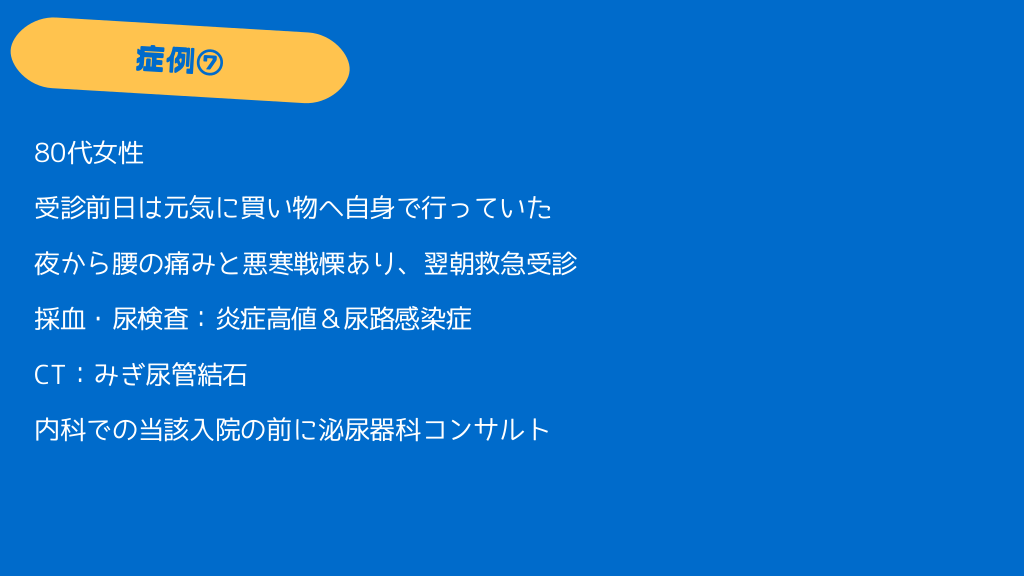 #45. 80代女性 受診前日は元気に買い物へ自身で行っていた 夜から腰の痛みと悪寒戦慄あり、翌朝救急受診 採血・尿検査:炎症高値&尿路感染症 CT:みぎ尿管結石 内科での当該入院の前に泌尿器科コンサルト