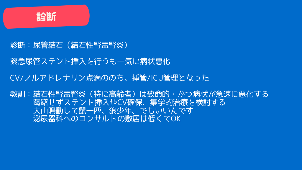 #46. 診断:尿管結石(結石性腎盂腎炎) 緊急尿管ステント挿入を行うも一気に病状悪化 CV/ノルアドレナリン点滴ののち、挿管/ICU管理となった 教訓:結石性腎盂腎炎(特に高齢者)は致命的・かつ病状が急速に悪化する 躊躇せずステント挿入やCV確保、集学的治療を検討する 大山鳴動して鼠一匹、狼少年、でもいいんです 泌尿器科へのコンサルトの敷居は低くてOK