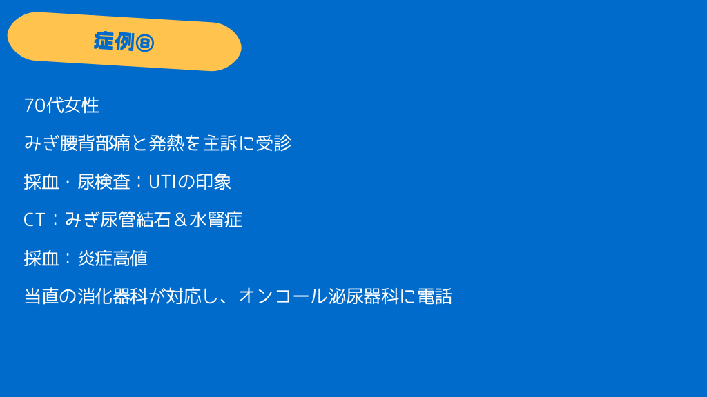 #47. 70代女性 みぎ腰背部痛と発熱を主訴に受診 採血・尿検査:UTIの印象 CT:みぎ尿管結石&水腎症 採血:炎症高値 当直の消化器科が対応し、オンコール泌尿器科に電話