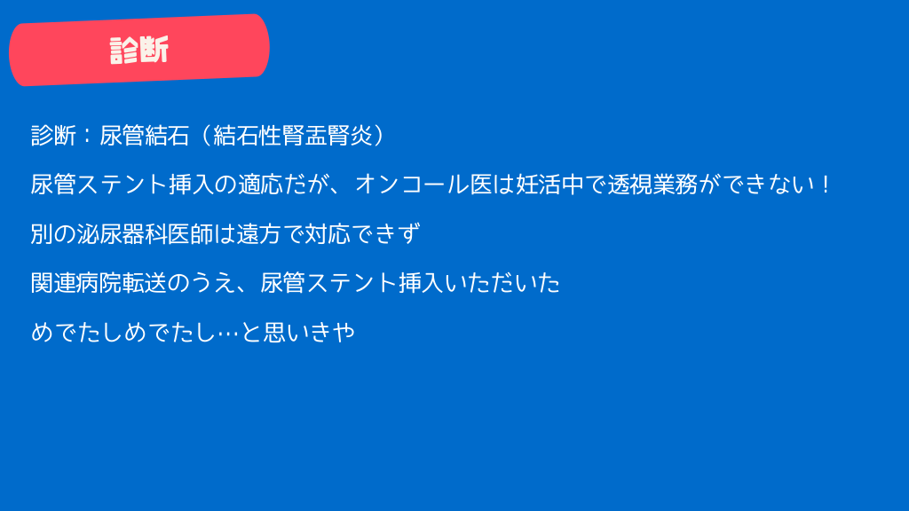 #48. 診断:尿管結石(結石性腎盂腎炎) 尿管ステント挿入の適応だが、オンコール医は妊活中で透視業務ができない! 別の泌尿器科医師は遠方で対応できず 関連病院転送のうえ、尿管ステント挿入いただいた めでたしめでたし…と思いきや
