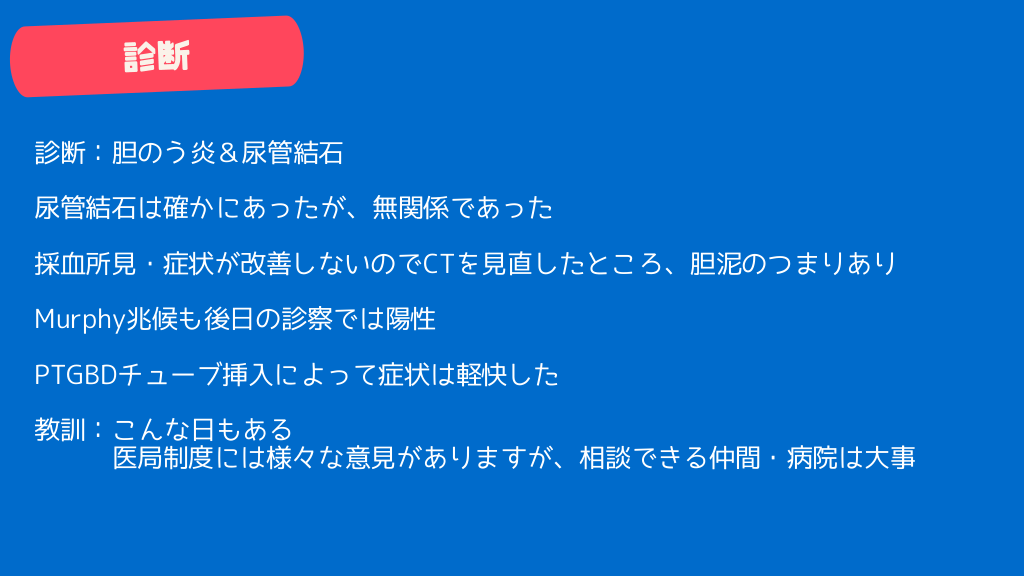 #49. 診断:胆のう炎&尿管結石 尿管結石は確かにあったが、無関係であった 採血所見・症状が改善しないのでCTを見直したところ、胆泥のつまりあり Murphy兆候も後日の診察では陽性 PTGBDチューブ挿入によって症状は軽快した 教訓:こんな日もある 医局制度には様々な意見がありますが、相談できる仲間・病院は大事