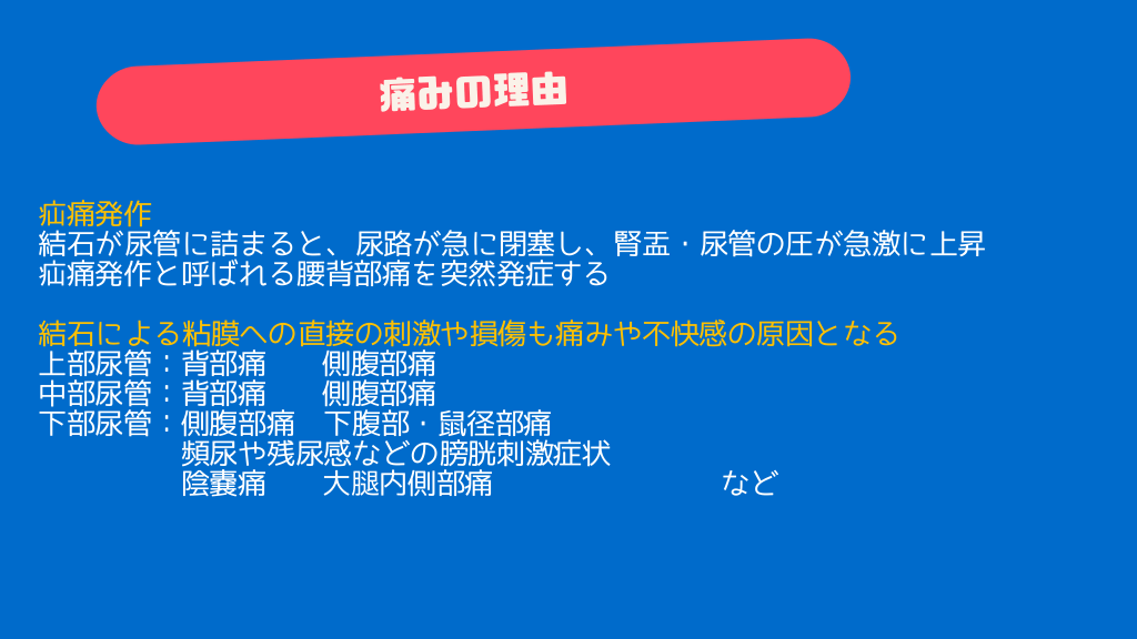 #5. 疝痛発作 結石が尿管に詰まると、尿路が急に閉塞し、腎盂・尿管の圧が急激に上昇 疝痛発作と呼ばれる腰背部痛を突然発症する 結石による粘膜への直接の刺激や損傷も痛みや不快感の原因となる 上部尿管:背部痛 側腹部痛 中部尿管:背部痛 側腹部痛 下部尿管:側腹部痛 下腹部・鼠径部痛 頻尿や残尿感などの膀胱刺激症状 陰嚢痛 大腿内側部痛 など