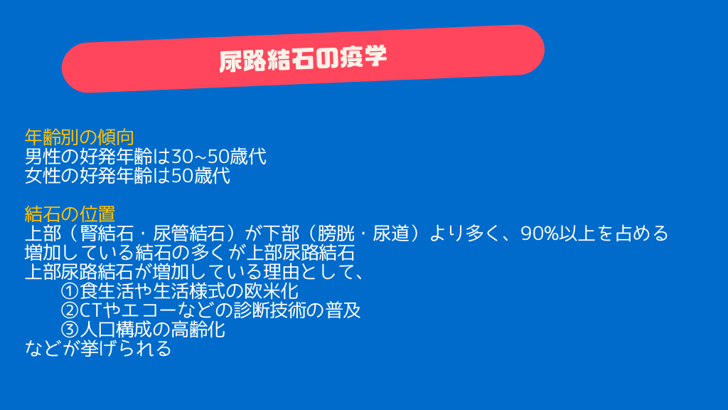 #7. 年齢別の傾向 男性の好発年齢は30~50歳代 女性の好発年齢は50歳代 結石の位置 上部(腎結石・尿管結石)が下部(膀胱・尿道)より多く、90%以上を占める 増加している結石の多くが上部尿路結石 上部尿路結石が増加している理由として、 ①食生活や生活様式の欧米化 ②CTやエコーなどの診断技術の普及 ③人口構成の高齢化 などが挙げられる