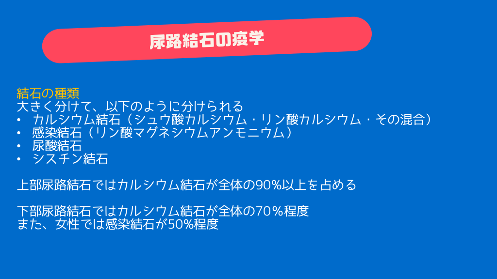 #8. 結石の種類 大きく分けて、以下のように分けられる • カルシウム結石(シュウ酸カルシウム・リン酸カルシウム・その混合) • 感染結石(リン酸マグネシウムアンモニウム) • 尿酸結石 • シスチン結石 上部尿路結石ではカルシウム結石が全体の90%以上を占める 下部尿路結石ではカルシウム結石が全体の70%程度 また、女性では感染結石が50%程度