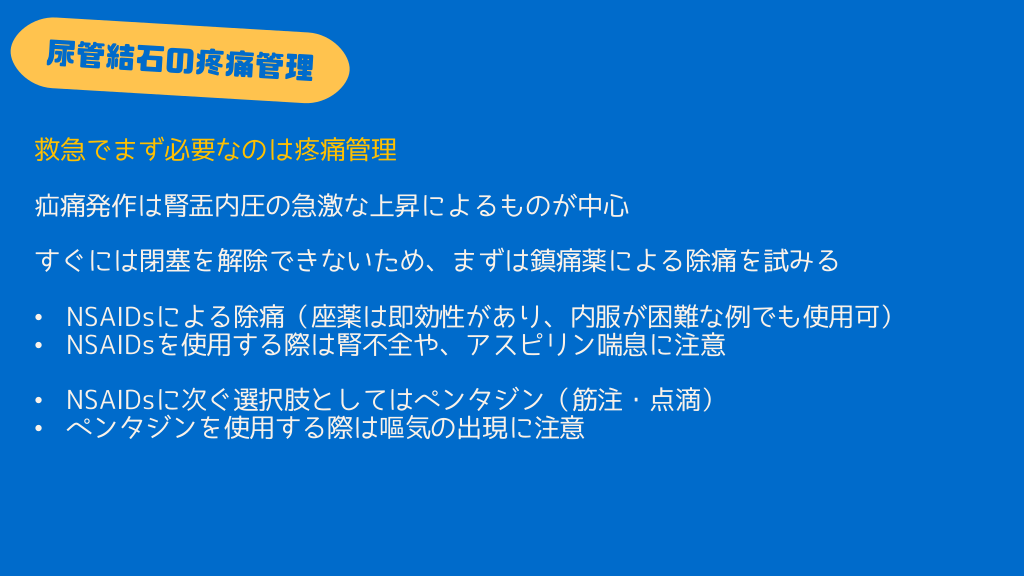 #9. 救急でまず必要なのは疼痛管理 疝痛発作は腎盂内圧の急激な上昇によるものが中心 すぐには閉塞を解除できないため、まずは鎮痛薬による除痛を試みる • NSAIDsによる除痛(座薬は即効性があり、内服が困難な例でも使用可) • NSAIDsを使用する際は腎不全や、アスピリン喘息に注意 • NSAIDsに次ぐ選択肢としてはペンタジン(筋注・点滴) • ペンタジンを使用する際は嘔気の出現に注意