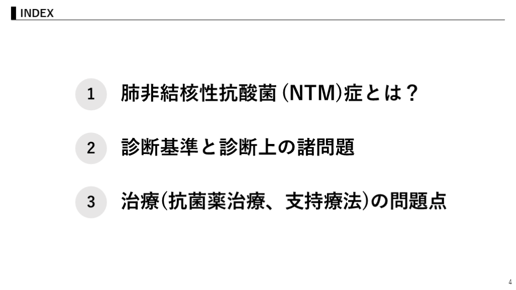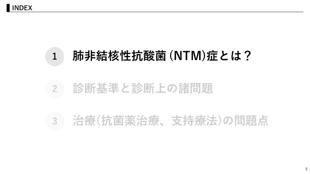 4 1 2 3 肺非結核性抗酸菌 (NTM)症とは? 診断基準と診断上の諸問題 治療(抗菌薬治療、支持療法)の問題点 INDEX #5.