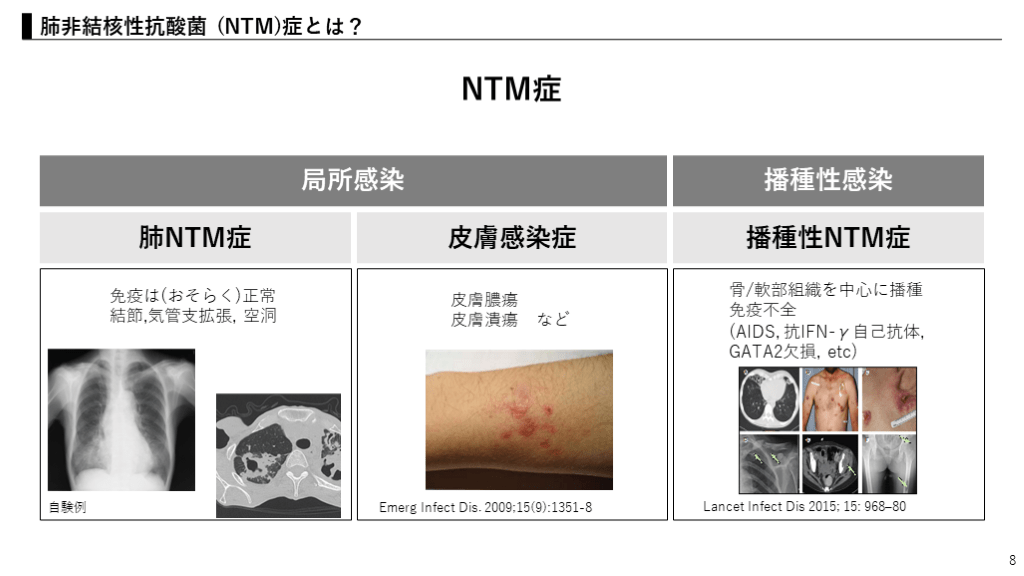 8 NTM症 肺非結核性抗酸菌 (NTM)症とは? 局所感染 肺NTM症 皮膚感染症 播種性NTM症 播種性感染 免疫は(おそらく)正常