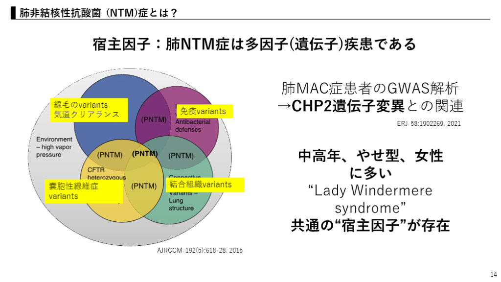 気道クリアランス 嚢胞性線維症variants 免疫variants 結合組織variants AJRCCM. 192(5):618-28, 2015 宿主因子:肺NTM症は多因子(遺伝子)疾患である 中高年、やせ型、女性に多い