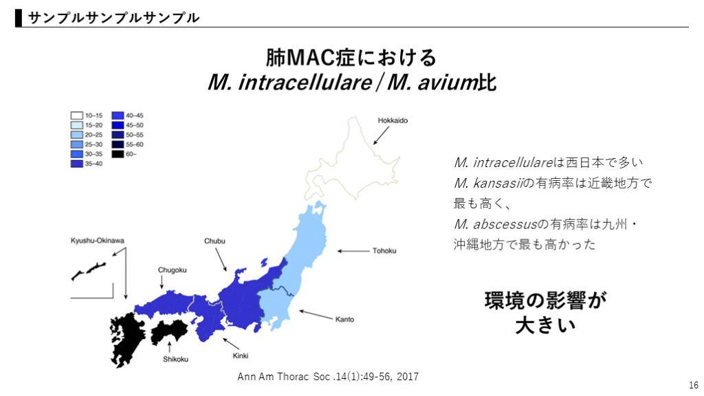 M. intracellulare /M. avium比 サンプルサンプルサンプル M. intracellulareは西日本で多い