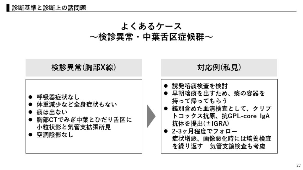 2-3ヶ月程度でフォロー症状増悪、画像悪化時には培養検査を繰り返す 気管支鏡検査も考慮 対応例(私見) #24.