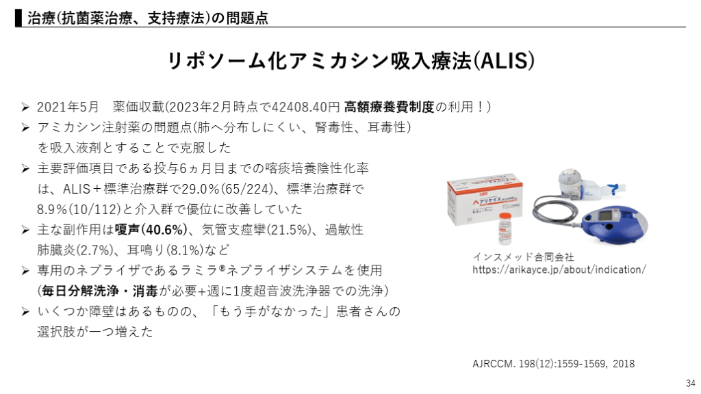 ・AMK点滴 外科治療も考慮 #34. 34 リポソーム化アミカシン吸入療法(ALIS) 治療(抗菌薬治療、支持療法)の問題点 2021年5月 薬価収載(2023年2月時点で42408.40円 高額療養費制度の利用!)