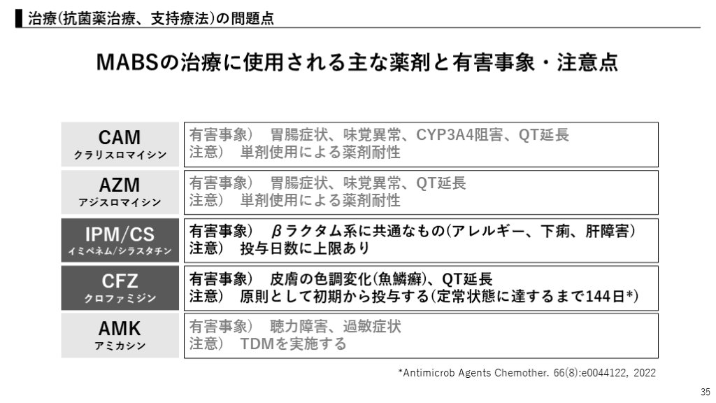 35 MABSの治療に使用される主な薬剤と有害事象・注意点 有害事象) 胃腸症状、味覚異常、CYP3A4阻害、QT延長