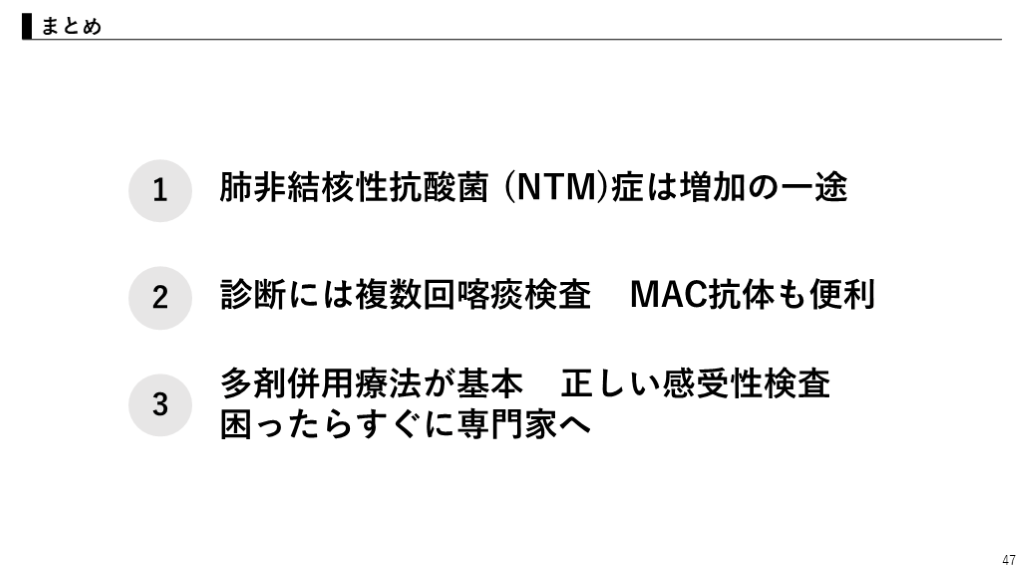 47 1 2 3 肺非結核性抗酸菌 (NTM)症は増加の一途 診断には複数回喀痰検査 MAC抗体も便利 多剤併用療法が基本 正しい感受性検査困ったらすぐに専門家へ まとめ