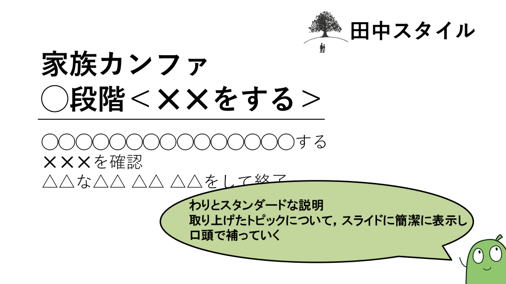 #2. 田中スタイル 家族カンファ ◯段階<✕✕をする> ◯◯◯◯◯◯◯◯◯◯◯◯◯◯◯する ✕✕✕を確認 △△な△△ △△ △△をして終了 わりとスタンダードな説明 取り上げたトピックについて,スライドに簡潔に表示し 口頭で補っていく