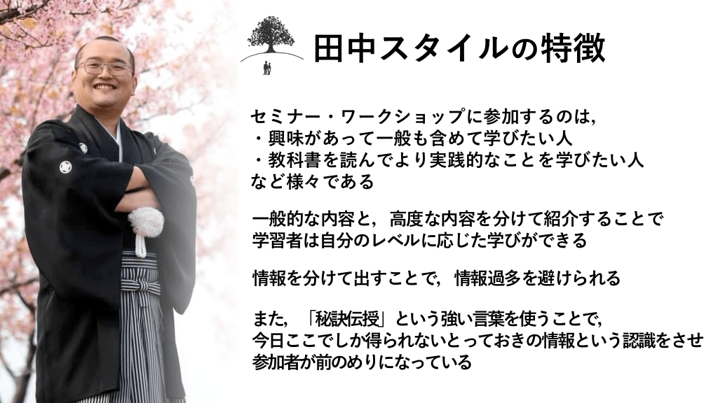 #5. 田中スタイルの特徴 セミナー・ワークショップに参加するのは, ・興味があって一般も含めて学びたい人 ・教科書を読んでより実践的なことを学びたい人 など様々である 一般的な内容と,高度な内容を分けて紹介することで 学習者は自分のレベルに応じた学びができる 情報を分けて出すことで,情報過多を避けられる また,「秘訣伝授」という強い言葉を使うことで, 今日ここでしか得られないとっておきの情報という認識をさせ 参加者が前のめりになっている