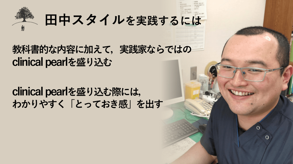 #6. 田中スタイルを実践するには 教科書的な内容に加えて,実践家ならではの clinical pearlを盛り込む clinical pearlを盛り込む際には, わかりやすく「とっておき感」を出す