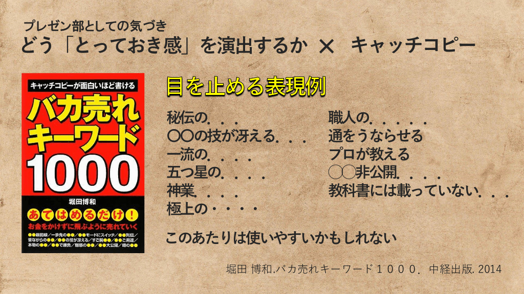 #7. プレゼン部としての気づき どう「とっておき感」を演出するか ✕ キャッチコピー 秘伝の... 〇〇の技が冴える... 一流の.... 五つ星の.... 神業.... 極上の・・・・ 職人の..... 通をうならせる プロが教える ◯◯非公開.... 教科書には載っていない... このあたりは使いやすいかもしれない 堀田 博和.バカ売れキーワード1000.中経出版. 2014