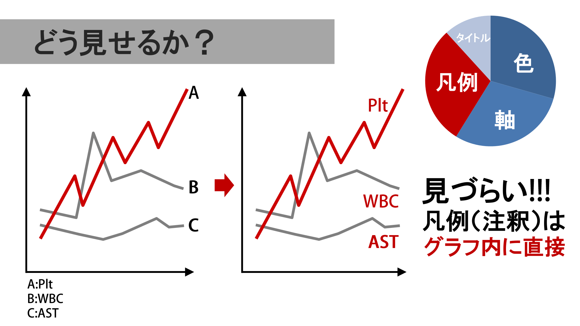 #15. どう見せるか? タイトル 凡例 色 軸 見づらい 凡例(注釈)は グラフ内に直接