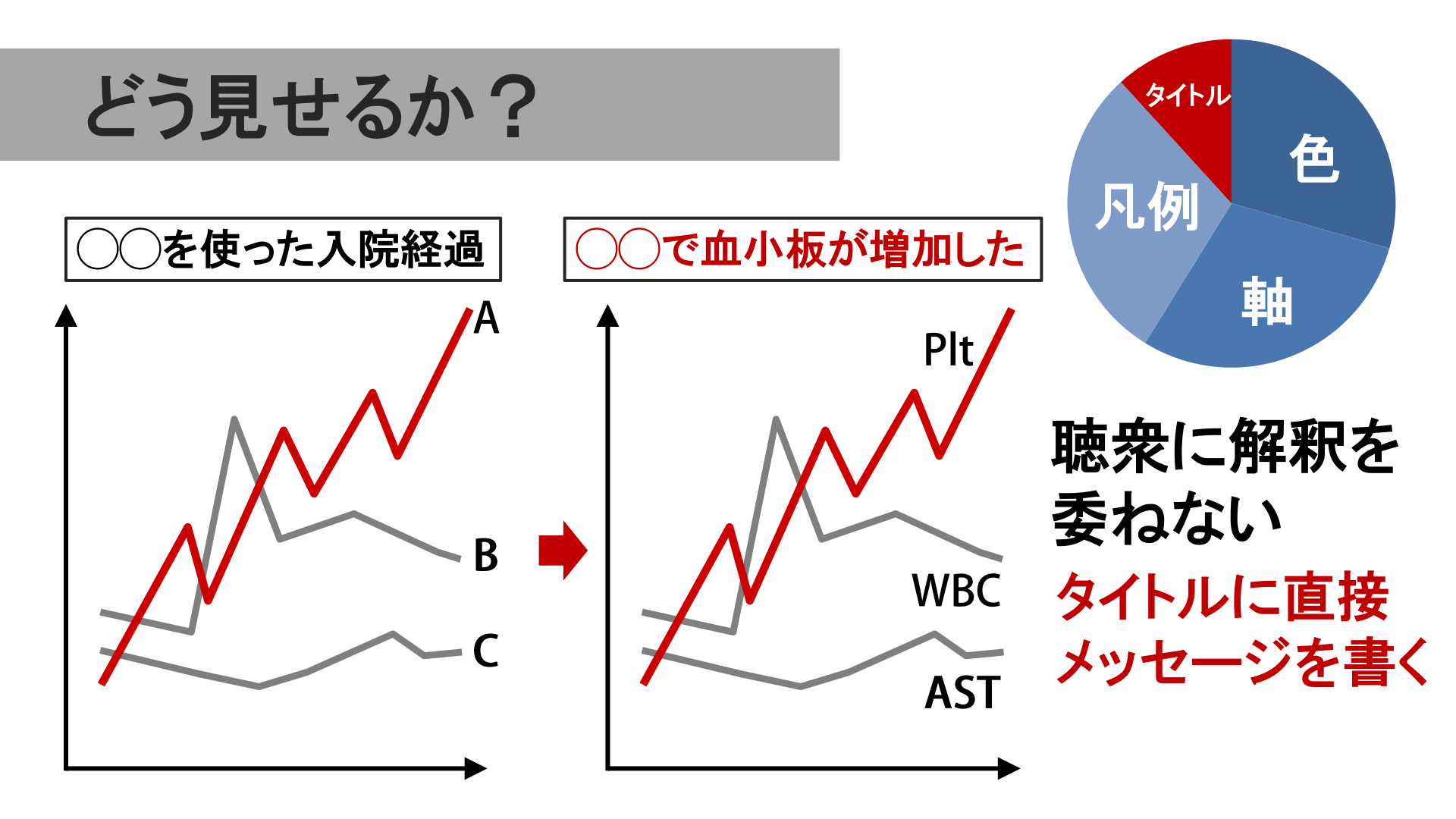 #16. どう見せるか? ◯◯を使った入院経過 タイトル ◯◯で血小板が増加した 凡例 色 軸 聴衆に解釈を 委ねない タイトルに直接 メッセージを書く