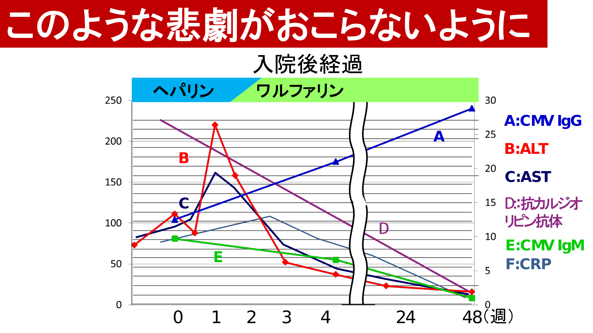 #2. このような悲劇がおこらないように 入院後経過 ヘパリン ワルファリン A:CMV IgG A B B:ALT C:AST :抗カルジオ リピン抗体 C E:CMV IgM F:CRP E 00 11 22 33 44 24 48(週)