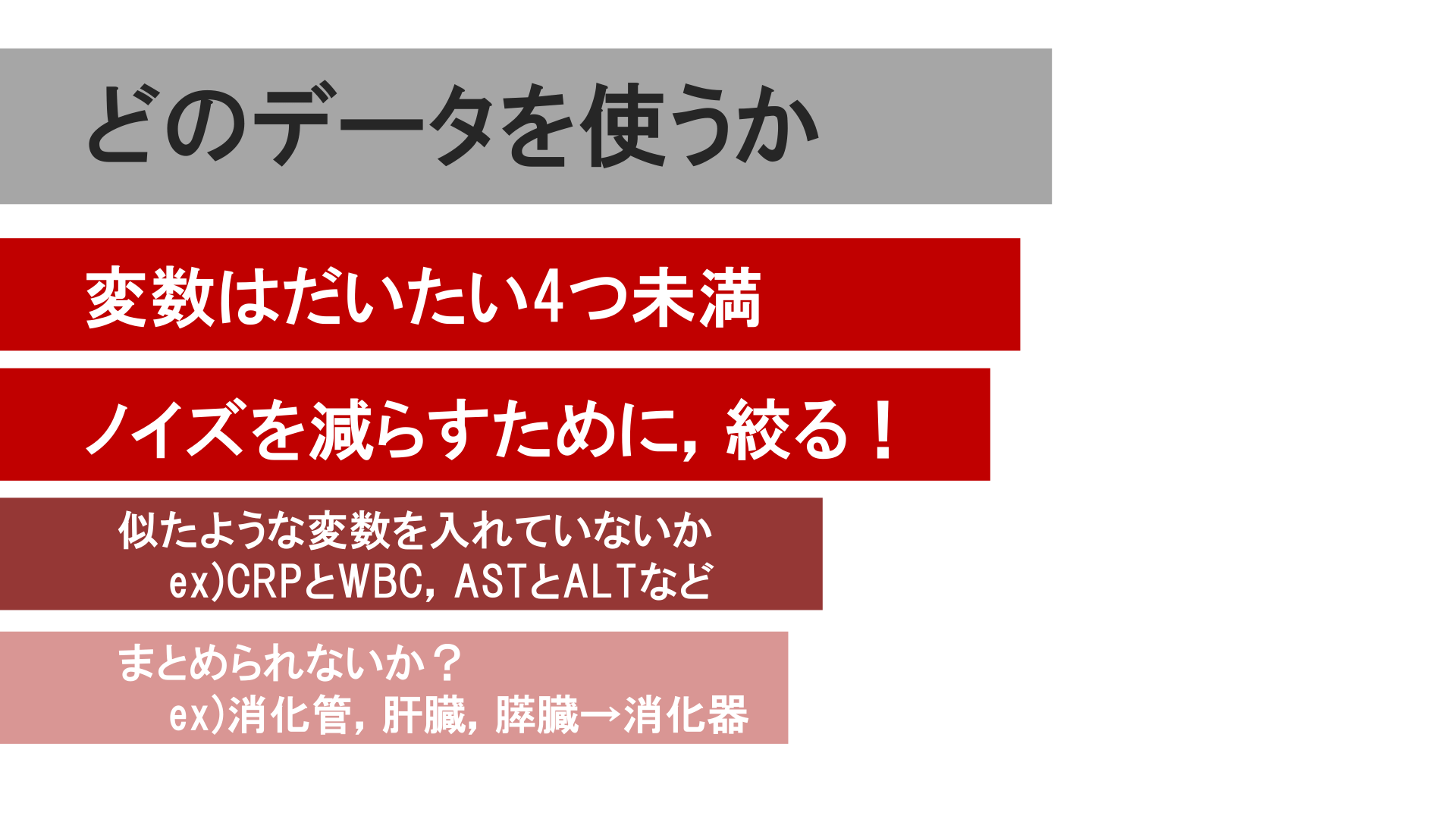 #5. どのデータを使うか 変数はだいたい4つ未満 ノイズを減らすために,絞る! 似たような変数を入れていないか ex)CRPとWBC,ASTとALTなど まとめられないか? ex)消化管,肝臓,膵臓→消化器