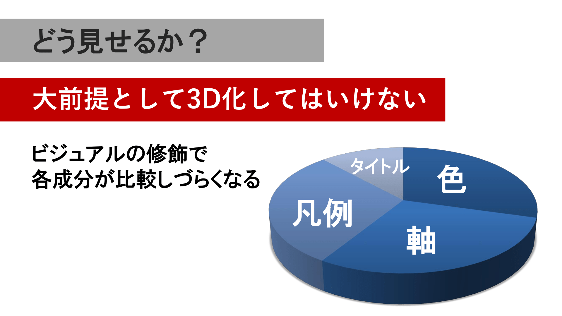 #7. どう見せるか? 大前提として3D化してはいけない ビジュアルの修飾で 各成分が比較しづらくなる タイトル 凡例 色 軸